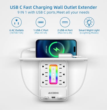 The AICODE Socket Outlet Shelf Wall Outlet Extender transforms a single wall socket into a powerful charging hub. With 6 AC outlets and 3 USB ports, including USB-C, it can power multiple devices at once. The built-in shelf keeps phones, toothbrushes, or gadgets neatly organized while charging. It also includes a smart night light with multiple color modes and 900J surge protection to keep your electronics safe. Perfect for bedrooms, bathrooms, dorms, and workspaces where you need more outlets and less cable clutter.