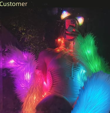 Stand out at any event with this faux fur LED jacket featuring smart voice-control lights that can sync with music and change into 100 colors via app or button. Warm, eye-catching, and perfect for festivals, concerts, Halloween, and winter nights. Works with AA batteries or a power bank.